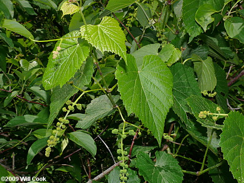 Plants high climbing, sparsely branched. Branches: bark exfoliating in shreds; nodal diaphragms 1.5–3.5 mm thick; branchlets slightly to distinctly angled, densely hirtellous and/or sparsely to densely arachnoid, to glabrate, growing tips not enveloped by unfolding leaves; tendrils along length of branchlets, persistent, branched, tendrils (or inflorescences) at only 2 consecutive nodes; nodes sometimes red-banded. Leaves: stipules 1–3 mm; petiole ± equaling blade; blade cordate, 6–20 cm, usually unlobed to 3-shouldered, sometimes 3-lobed, apex acute to acuminate, abaxial surface not glaucous, sparsely to densely arachnoid or glabrous, visible through hairs, veins and vein axils hirtellous, adaxial surface glabrous or hairy. Inflorescences 10–25 cm. Flowers functionally unisexual. Berries black, slightly or not glaucous, globose, 4–8 mm diam., skin separating from pulp, lenticels absent.